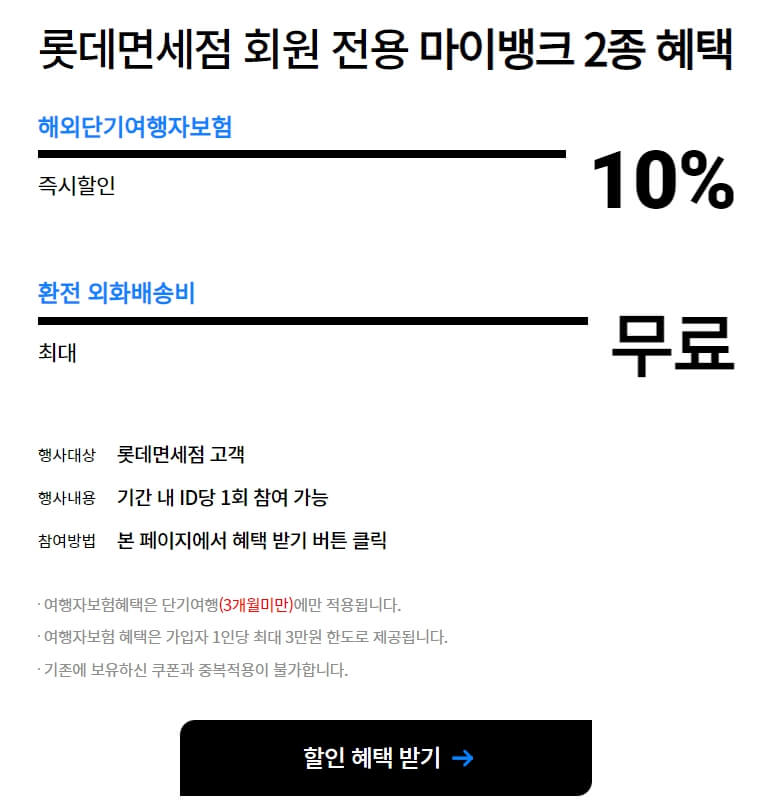 마이뱅크 여행자보험을 저렴하게 가입하기 위해서는 롯데 인터넷 면세점 사이트를 통해서 쿠폰을 발행받아 할인 혜택을 받을 수 있습니다.
