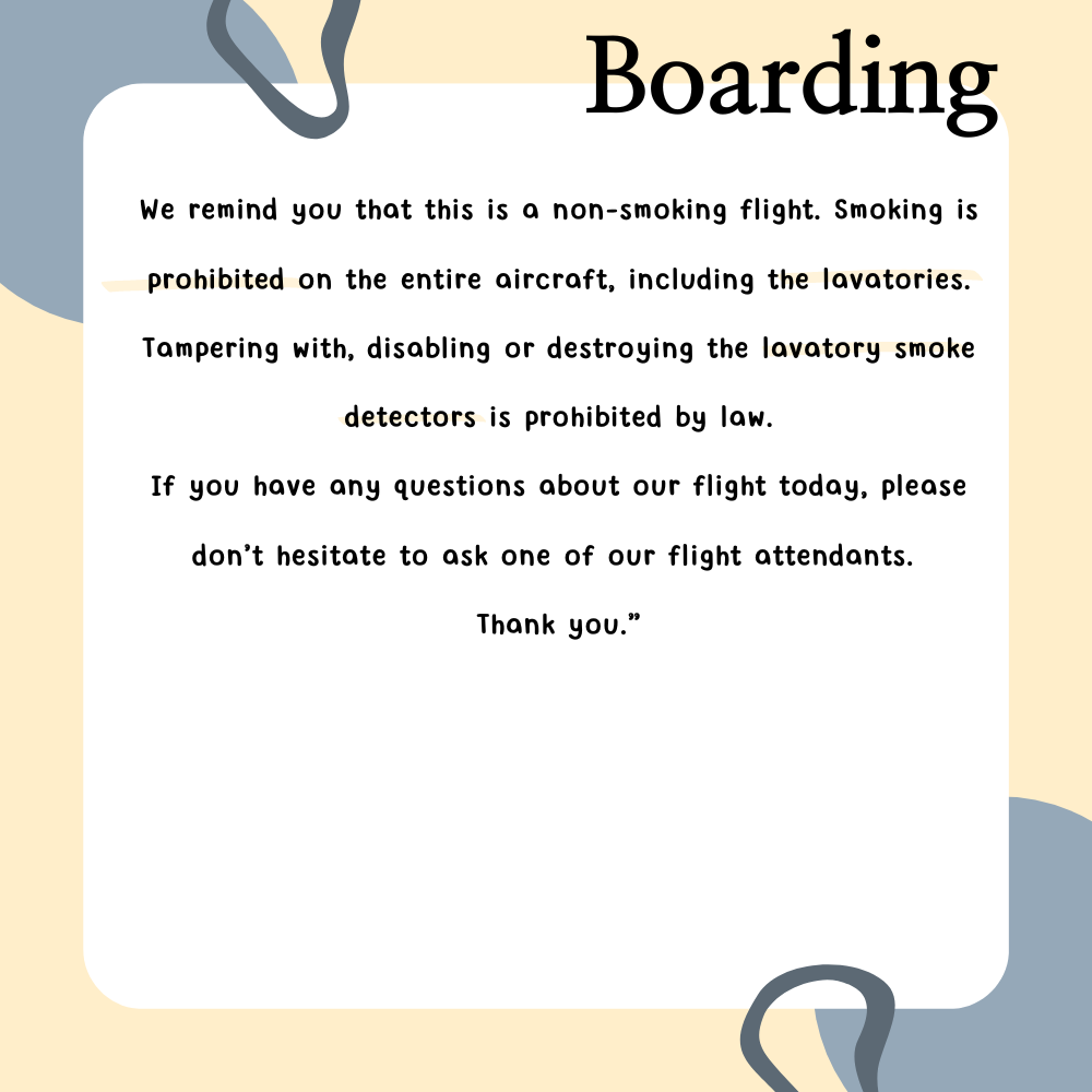 다음번에는 탑승 이후에 듣게 되는 이륙 준비에 관한 기내방송문으로 포스팅해보겠습니다.