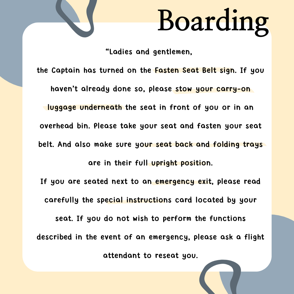 다음번에는 탑승 이후에 듣게 되는 이륙 준비에 관한 기내방송문으로 포스팅해보겠습니다.