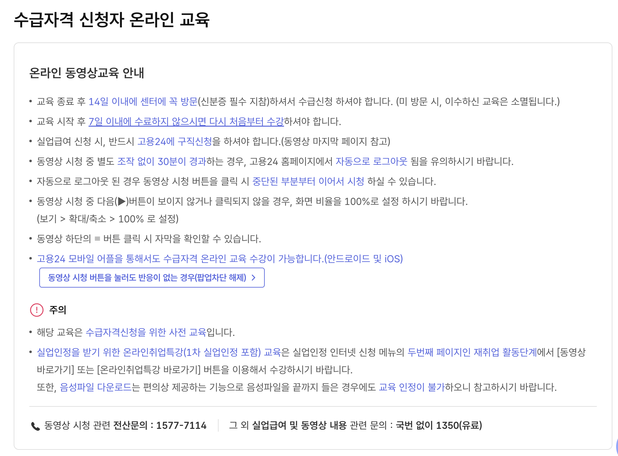 실업급여를 받기 위해서는 온라인으로 진행되는 필수 교육을 들어야 해요.
