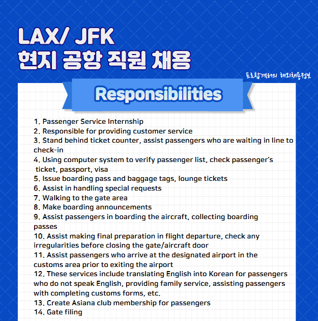 해당 채용을 진행하고 있는 구인기업은 한국의 대표 항공사 아시아나의 미국 공항 지점입니다.