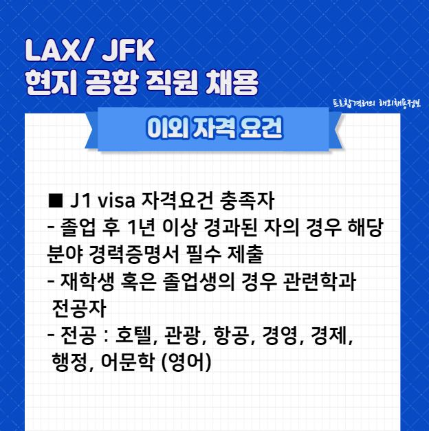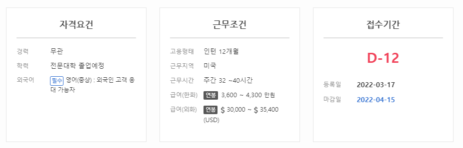 근무조건은 J1인턴비자로 미국에서 12개월간 인턴으로 근무하는 조건입니다.