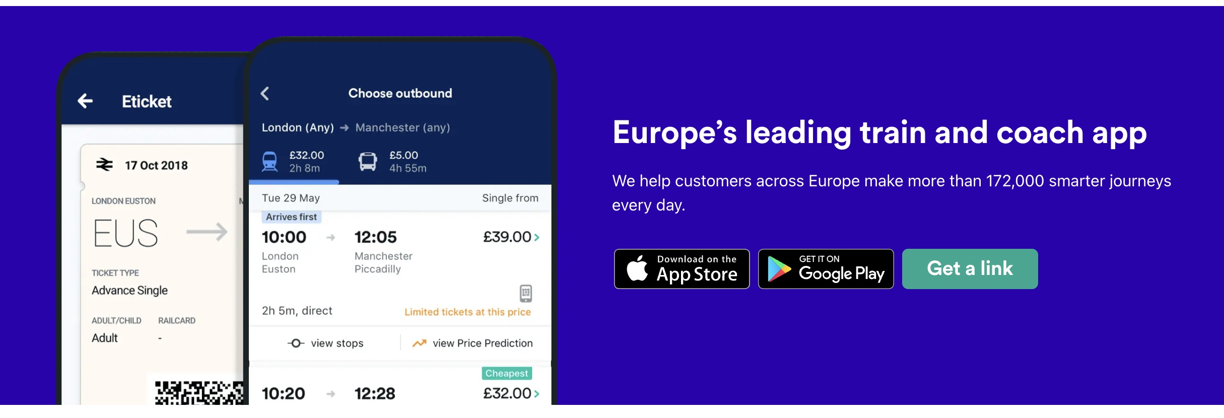 Welcome aboard Trainline. Travel confidently with Europe’s leading train and coach app. We’ve made it quick and easy for you to travel across the UK and the rest of Europe by rail and road. Book tickets for Avanti West Coast, GWR, LNER, National Exp