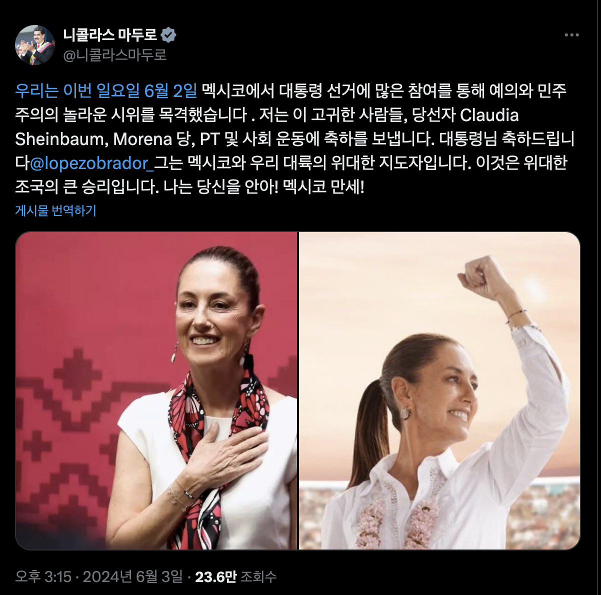 멕시코의 새 대통령 멕시코의 새 대통령으로 취임한 클라우디아입니다.