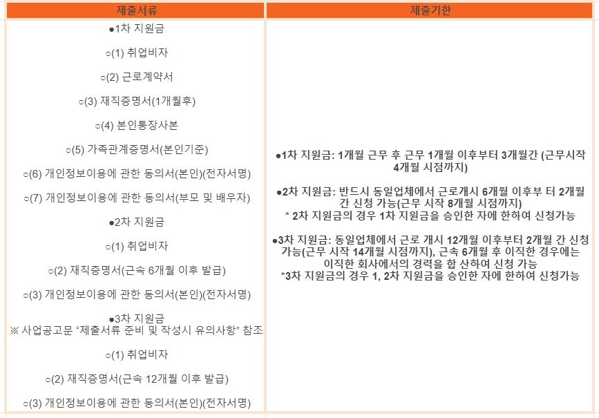 지원금액은 한번에 500만원을 일시로 주는것은 아닙니다. 취업 후 첫달에 절반의 금액인 250만원을 받습니다. 그리고 취업한지 6개월이 되면 100만원을 추가로 받고 나머지 150만원은 1년을 채웠을때 받게됩니다.