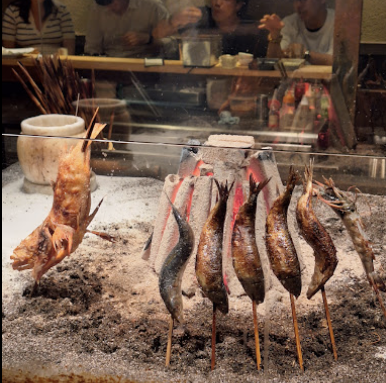 들어가자마자 가장 눈에 띄는 건 역시 이 화로였어요. 새우와 다양한 꼬치들이 꽂혀있어서 비주얼 자체가 압도적이었어요. 구워지는 과정을 눈앞에서 보니까 정말 맛있어 보였어요. 🤤