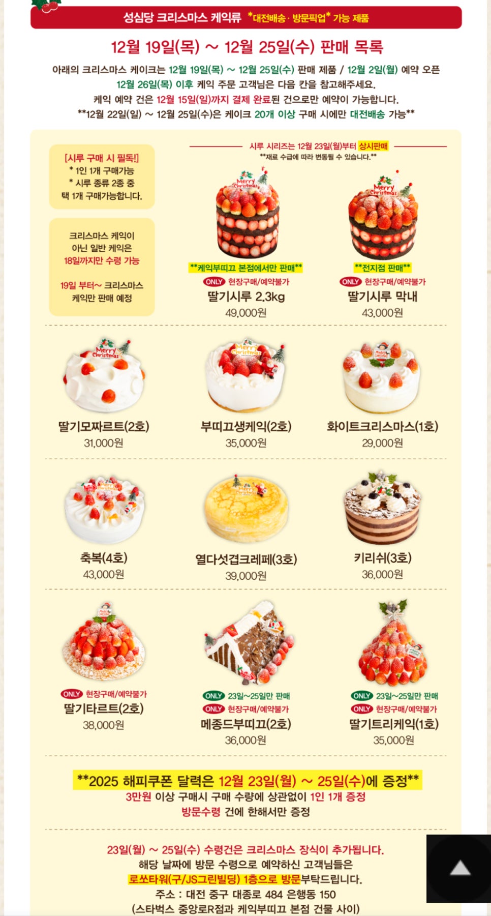 - 12월 22일~25일: 케이크 20개 이상 구매 시 대전 배송 가능