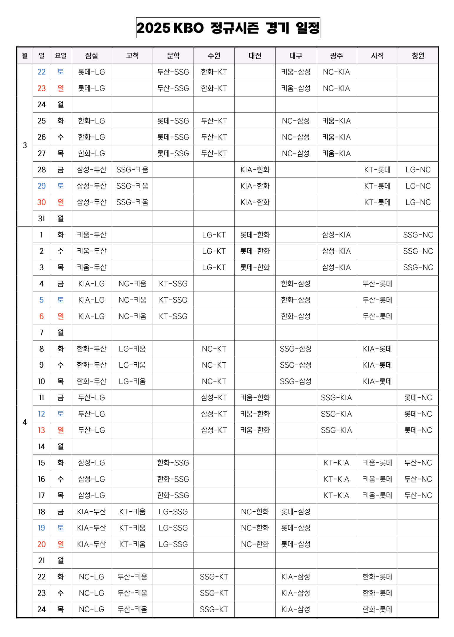 정규 시즌은 3월 22일 개막 이후 10월 초까지 이어질 예정이에요. 팀당 총 144경기를 치르며, 올해도 긴 시즌 동안 치열한 순위 경쟁이 예상됩니다.