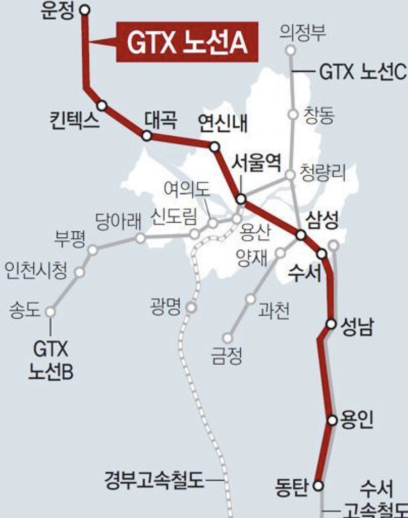 GTX A노선은 경기도 파주 운정역에서 출발해 서울을 거쳐 화성 동탄역까지 연결하는 수도권 광역급행철도입니다.